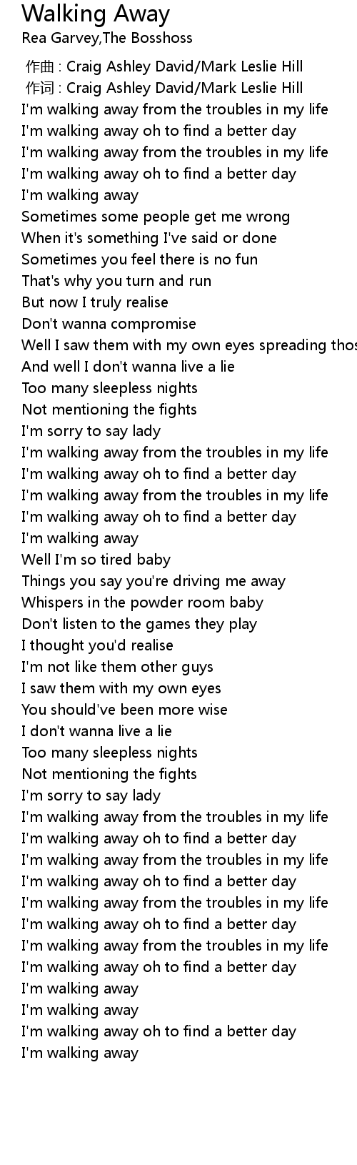 | [00:30.36] | I' m walking away from the troubles in my life |