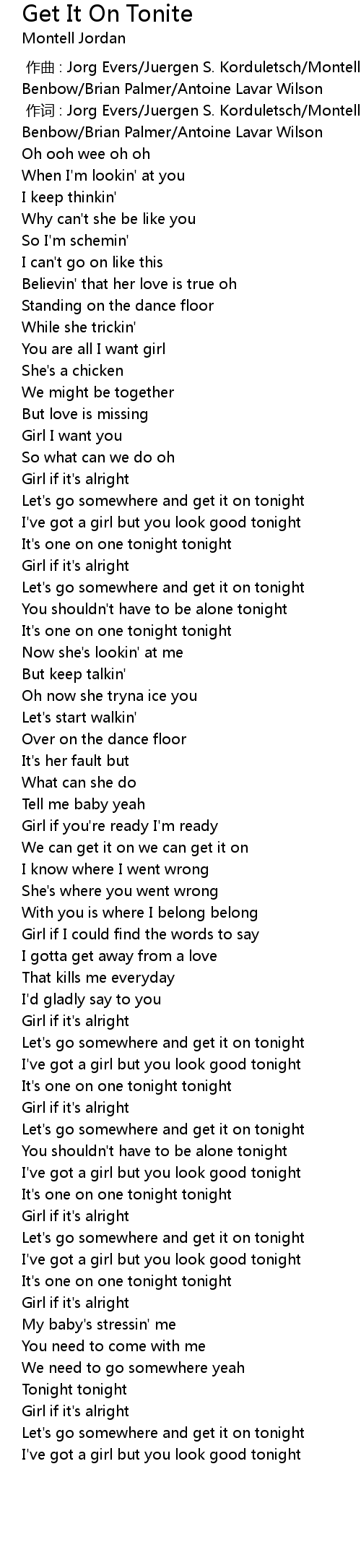 | [00:50.68] | Let' s go somewhere and get it on tonight |