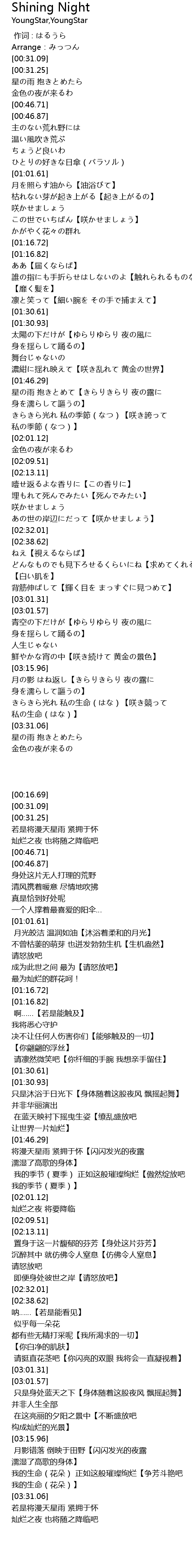 | [00:31.30] | 星の雨 抱きとめたら |