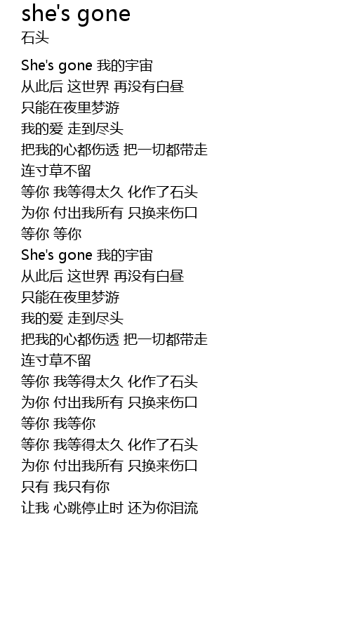 | [00:32.79] | She' s gone wǒ de yǔ zhòu |