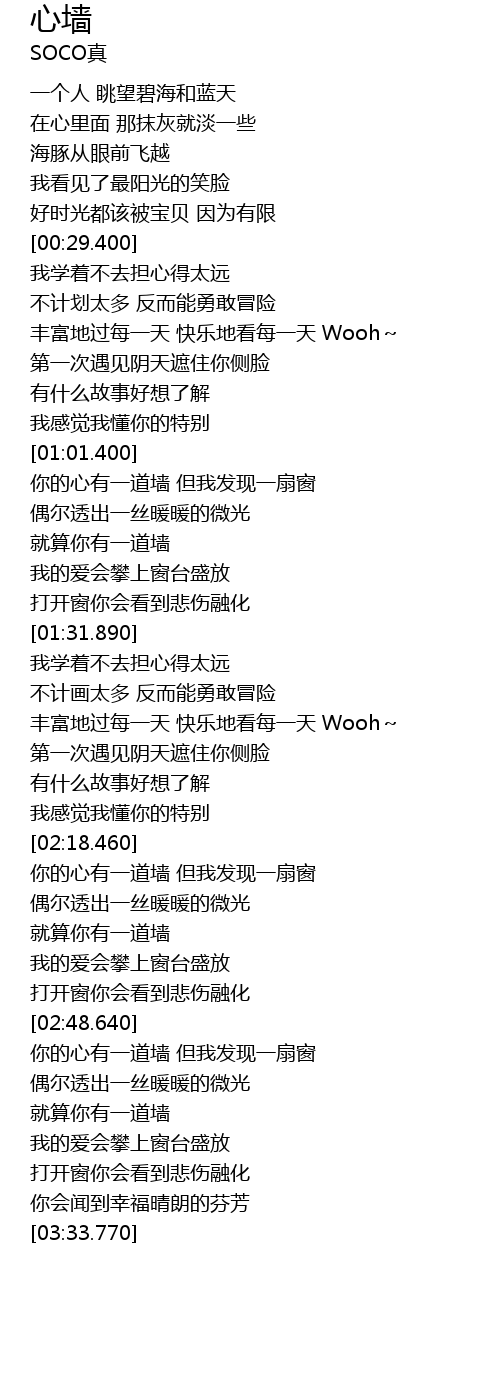 | [02:49.930] | 你的心有一道墙 但我发现一扇窗 |