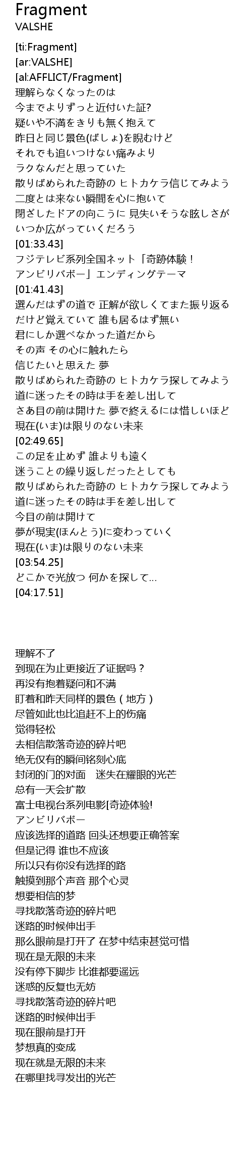 | [02:21.69] | 散りばめられた奇跡の ヒトカケラ探してみよう |