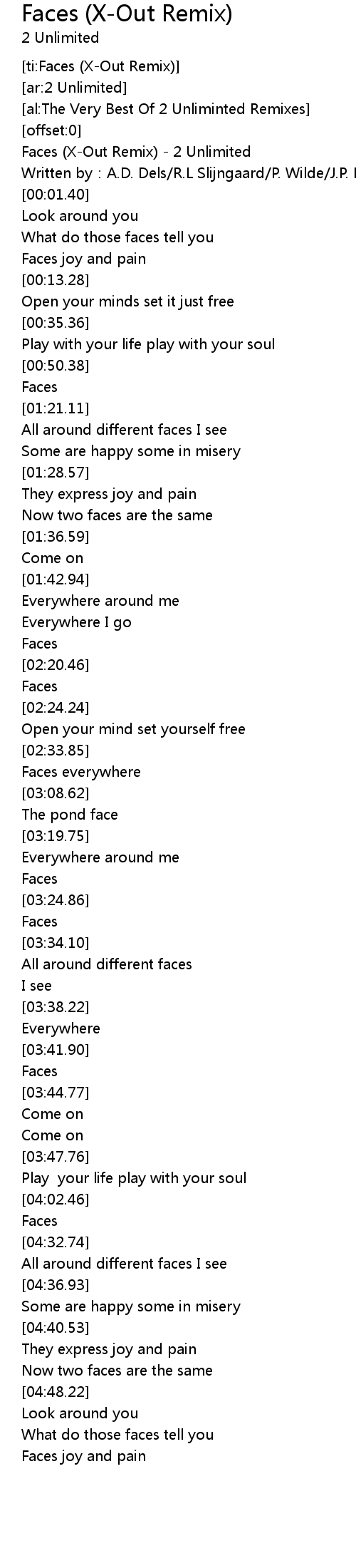 | [00:00.00] | Faces (X-Out Remix) - 2 Unlimited |