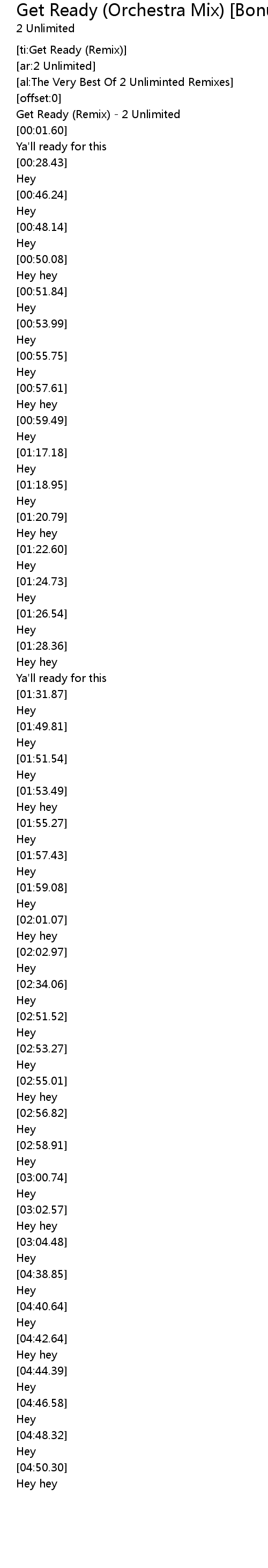 | [00:00.33] | Get Ready (Remix) - 2 Unlimited |