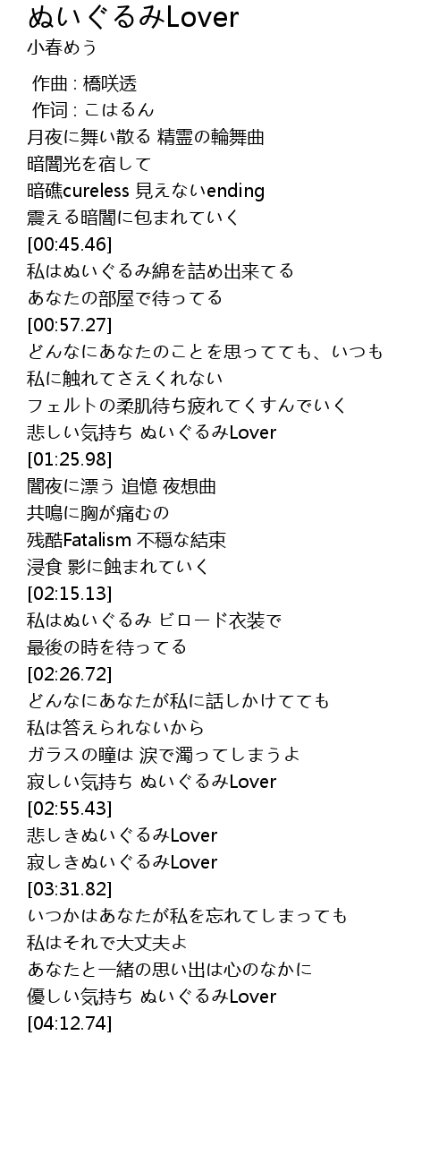 | [01:18.73] | 悲しい気持ち ぬいぐるみLover |