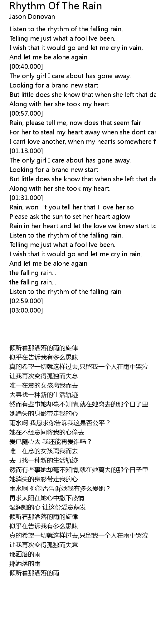 | [00:25.000] | Listen to the rhythm of the falling rain, |