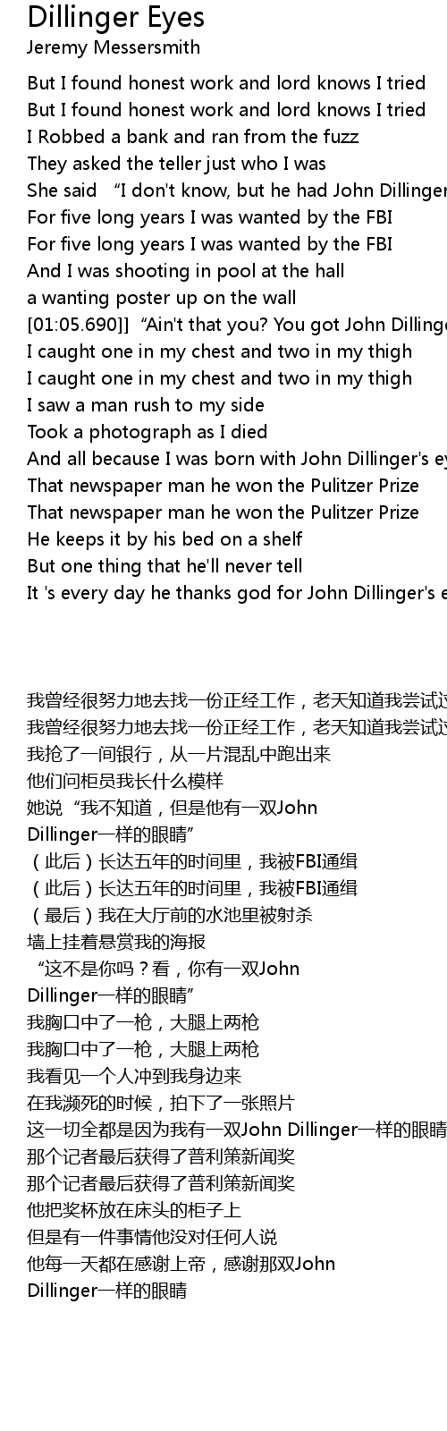 | [01:05.690]] | " Ain' t that you? You got John Dillinger' s eyes!" |