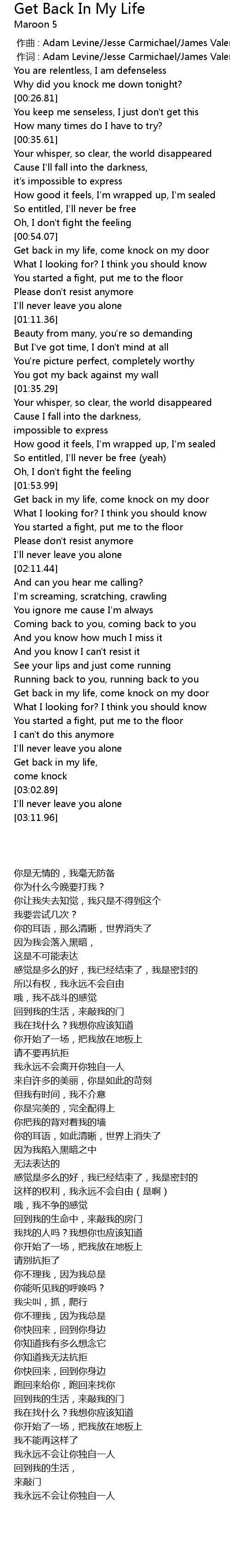 | [00:01.00] | zuò cí : Adam Levine Jesse Carmichael James Valentine |