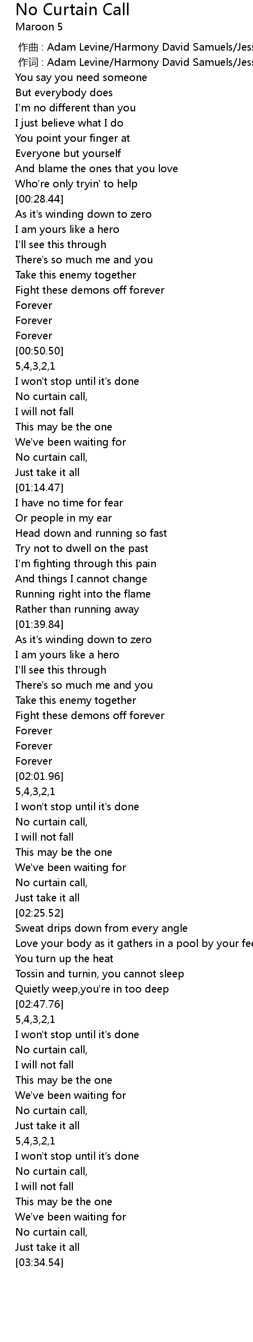 | [00:01.00] | 作词 : Adam Levine/Harmony David Samuels/Jesse Carmichael |