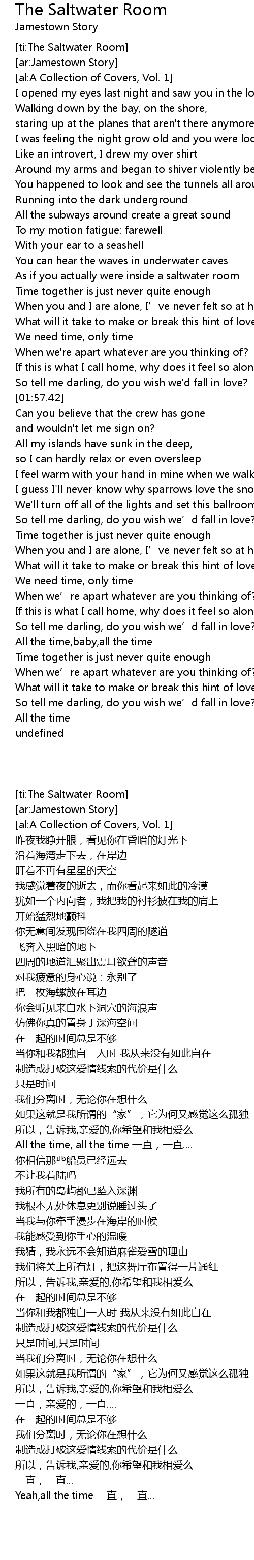 | [02:49.55] | When you and I are alone, I’ve never felt so at home |