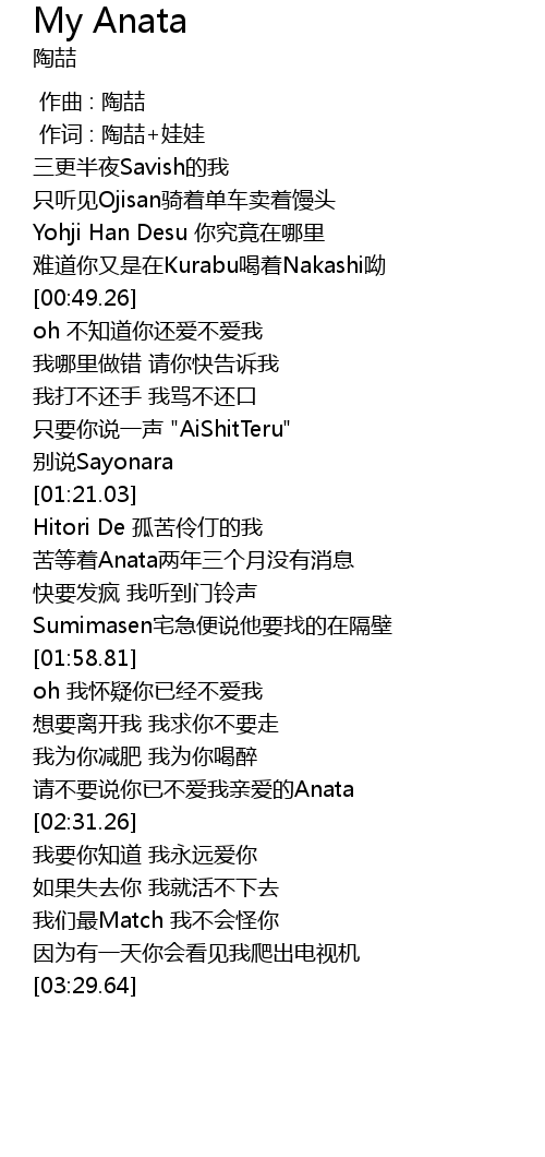 | [02:23.65] | 请不要说你已不爱我亲爱的Anata |