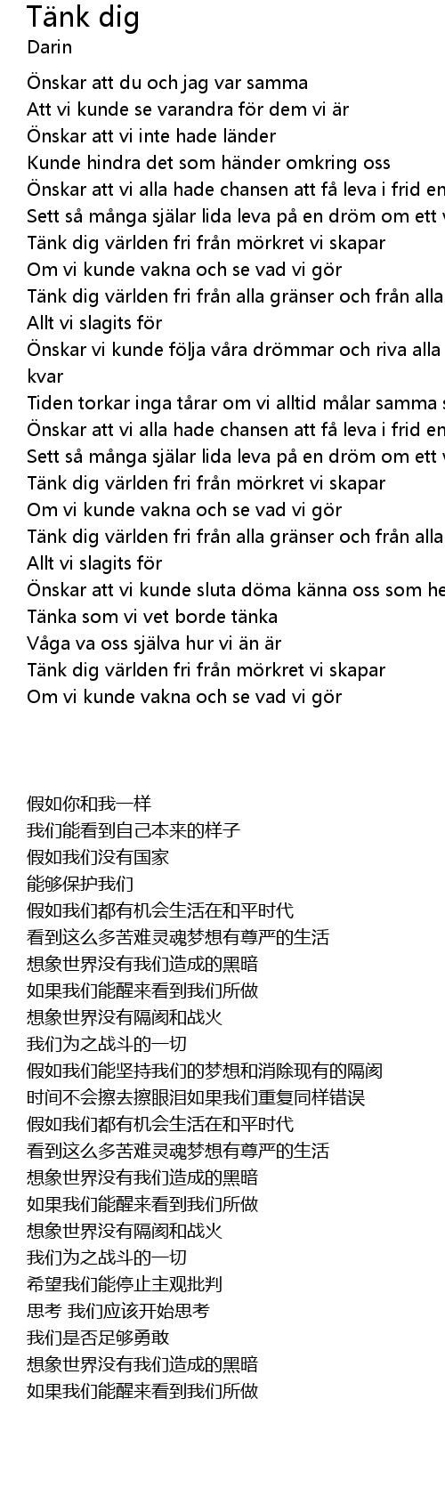 | [01:15.800] | T nk dig v rlden fri fr n alla gr nser och fr n alla br nder |