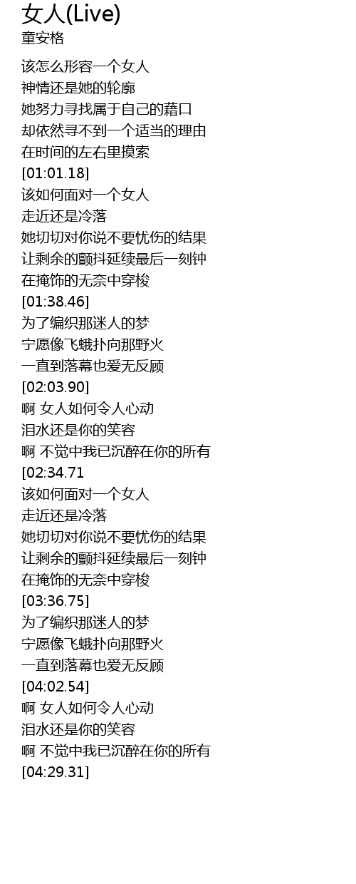 | [04:03.89] | a nǚ rén rú hé lìng rén xīn dòng |