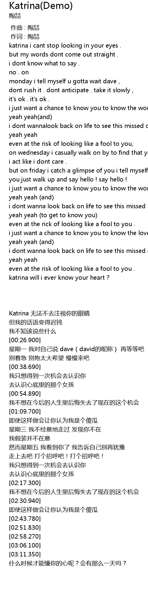 | [03:34.880] | katrina will i ever know your heart ? |