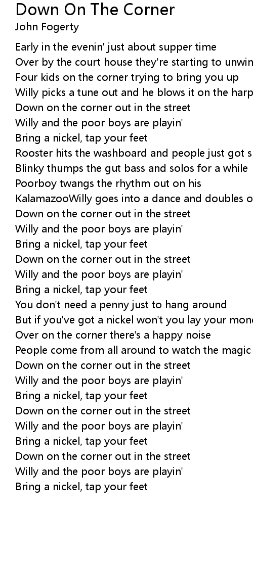 Down on the corner out in the street |