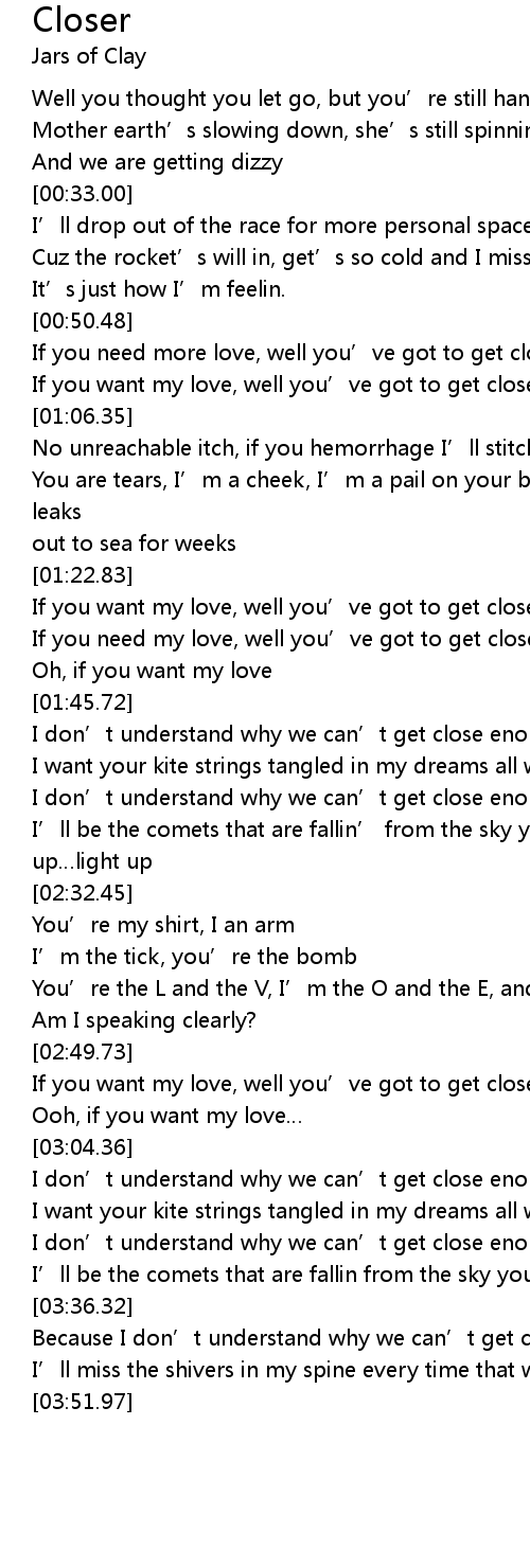 | [01:33.12] | If you need my love, well you’ve got to get closer to me |