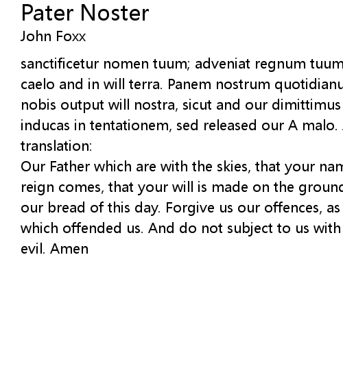 | sanctificetur nomen tuum; adveniat regnum tuum; FIAT voluntas killed, sicut in caelo and in will terra. Panem nostrum quotidianum da nobis hodie; and dimitte nobis output will nostra, sicut and our dimittimus debitoribus nostris; and our inducas in tentationem, sed released our A malo. Amen. | |