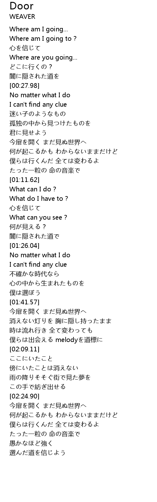 | [01:42.19] | 今扉を開く まだ見ぬ世界へ |