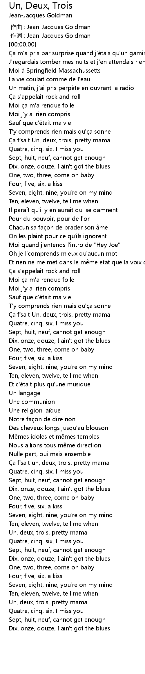 | [02:00.489] | Ça f'sait Un, deux, trois, pretty mama |