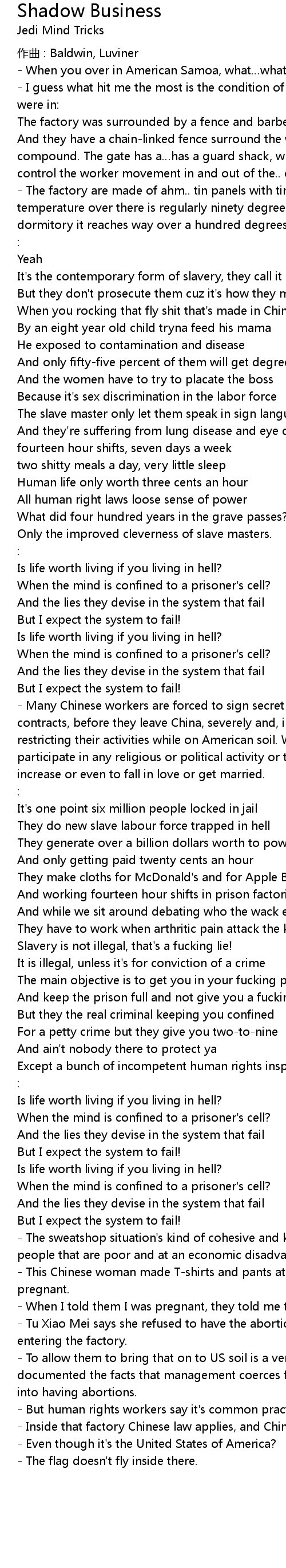 | - Many Chinese workers are forced to sign secret agreements, known as shadow contracts, before they leave China, severely and, in some ways, illegally restricting their activities while on American soil. Workers are forbidden to participate in any religious or political activity or to ask for a salary increase or even to fall in love or get married. | |