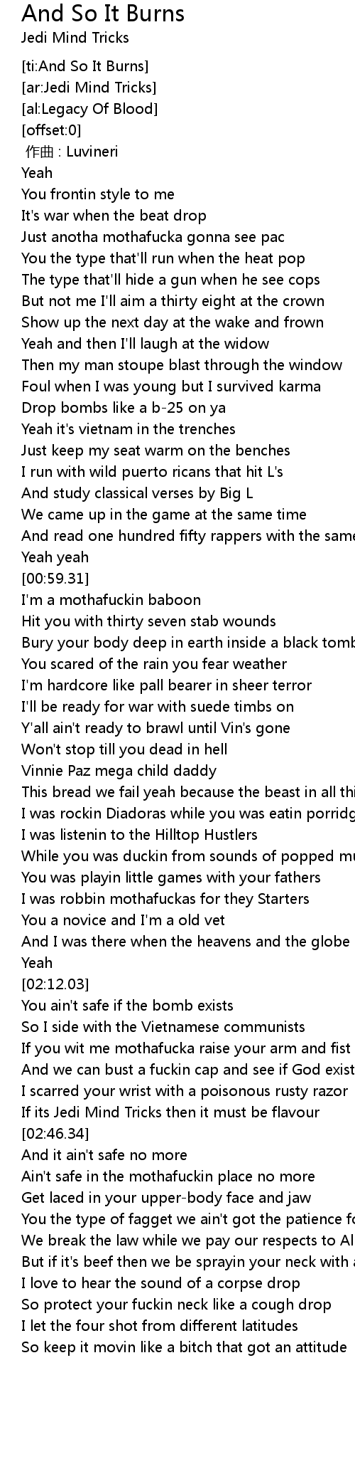 | [02:30.74] | You ain' t safe if the bomb exists |