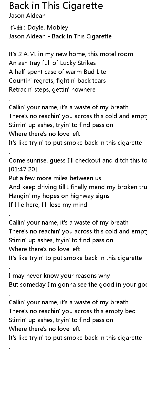 | [00:00.26] | Jason Aldean Back In This Cigarette |
