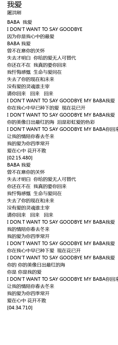 | [03:56.450] | I DON' T WANT TO SAY GOODBYE MY BABA wǒ ài |