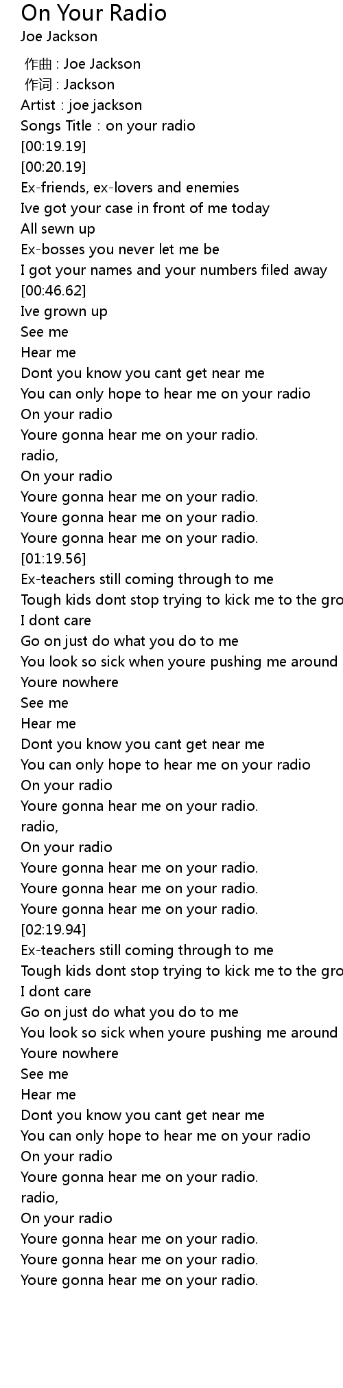 | [00:18.13] | Songs Title: on your radio |