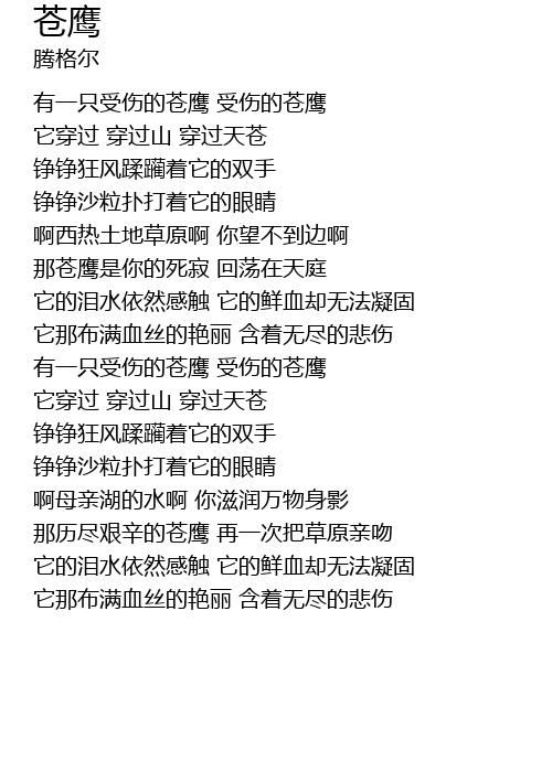 | [00:17.58] | 有一只受伤的苍鹰 受伤的苍鹰 |