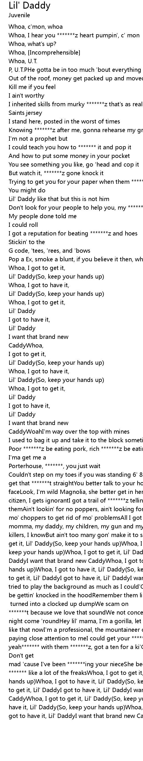 Couldn't step on my toes if you was standing 6' 8"It's mister 400 *******es, so get that *******t straightYou better talk to your hoe 'fore I put ******* in her faceLook, I'm wild Magnolia, she better get in her placeI ain't a law abiding citizen, I gets ignorantI got a trail of *******z telling cops what I did to themAin't lookin' for no poppers, ain't looking for no partnersI'm looking for mo' choppers to get rid of mo' problemsAll I got is my ball and my wordsMy momma, my daddy, my children, my gun and my herb*******t, they got a lot of killers, I knowBut ain't too many gon' make it to see 2004, whoaWhoa, I got to get it, Lil' Daddy(So, keep your hands up)Whoa, I got to have it, Lil' Daddy(So, keep your hands up)Whoa, I got to get it, Lil' DaddyI got to have it, Lil' DaddyI want that brand new CaddyWhoa, I got to get it, Lil' Daddy(So, keep your hands up)Whoa, I got to have it, Lil' Daddy(So, keep your hands up)Whoa, I got to get it, Lil' DaddyI got to have it, Lil' DaddyI want that brand new CaddyI tried to play the background as much as I could'Cause all the big mouth *******z be gettin' knocked in the hoodRemember them lil' *******z? They done grew up nowSo 'ret street and [Incomprehensible] turned into a clocked up dumpWe scam on *******t because we love that soundWe not concerned about waiting until the night come 'roundHey lil' mama, I'm a gorilla, let me pipe that downYeah, you like that nowI'm a professional, the mountaineer of the streetsI got old timers paying close attention to meI could get your *******t split for the minimum fee, yeah******* with them *******z, got a ten for a ki'Got a few princess cuts on the watch and the pieceI'll put it on your ass for a [Incomprehensible]Don't get mad 'cause I've been *******ing your nieceShe been giving head and eating ******* like a lot of the freaksWhoa, I got to get it, Lil' Daddy(So, keep your hands up)Whoa, I got to have it, Lil' Daddy(So, keep your hands up)Whoa, I got to get it, Lil' DaddyI got to have it, Lil' DaddyI want that brand new CaddyWhoa, I got to get it, Lil' Daddy(So, keep your hands up)Whoa, I got to have it, Lil' Daddy(So, keep your hands up)Whoa, I got to get it, Lil' DaddyI got to have it, Lil' DaddyI want that brand new CaddyWhoaWhoaWhoa... |
