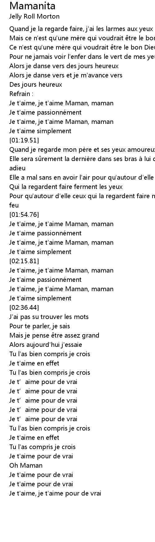 | [02:27.52] | Je t'aime, je t'aime Maman, maman |
