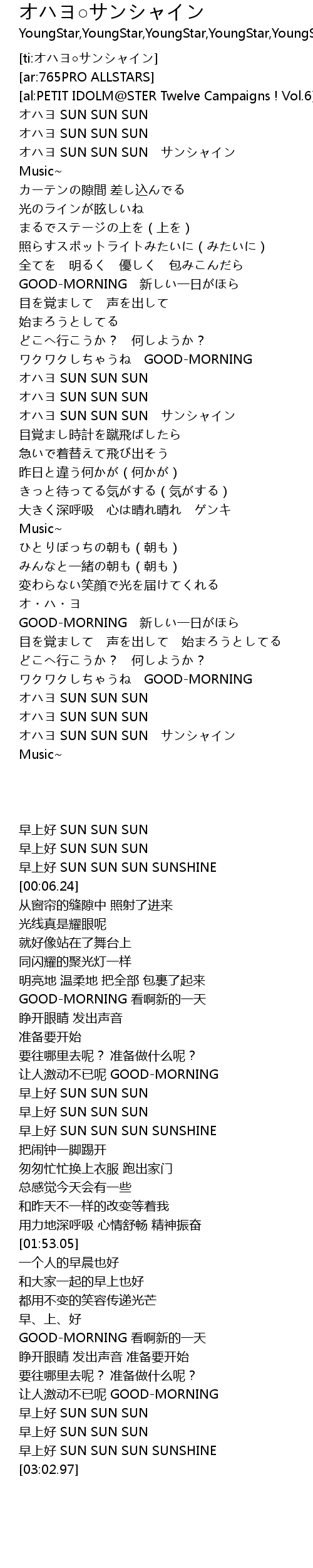 | [01:09.22] | オハヨ SUN SUN SUN サンシャイン |