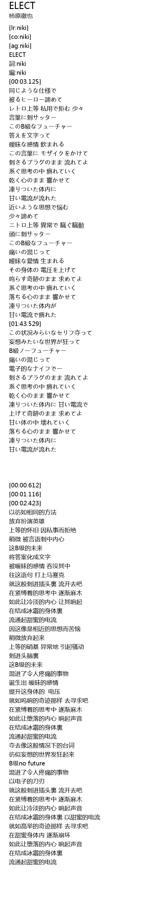 | [00:47.603] | 刺さるプラグのまま 流れてよ |