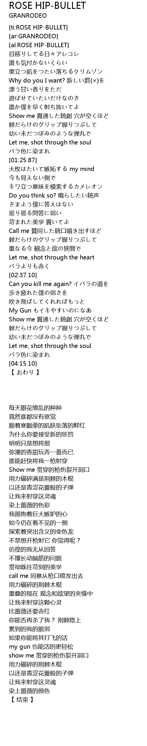 | [01:02.24] | Show me 貫通した銃創 穴が空くほど |