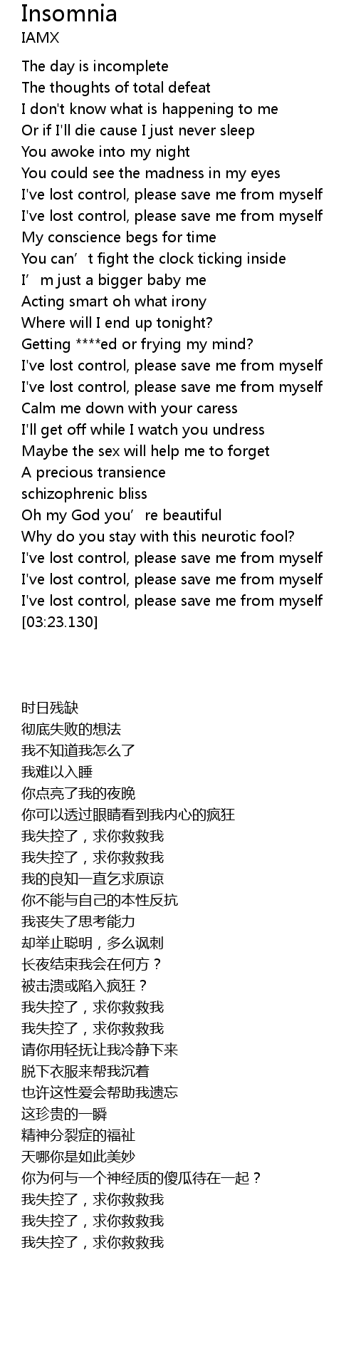 | [03:14.210] | I' ve lost control, please save me from myself |