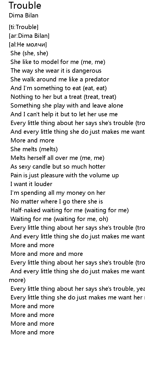 | [1:44.429] | Every little thing about her says she' s trouble trouble |