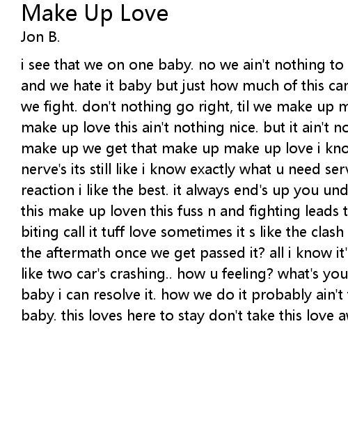 i see that we on one baby. no we ain't nothing to play with baby cause we love and we hate it baby but just how much of this can we take? it's crazy we fuss. we fight. don't nothing go right, til we make up make up. we get that make up make up love this ain't nothing nice. but it ain't nothing like when we make up make up we get that make up make up love i know sometimes we get on each others nerve's its still like i know exactly what u need served to get back to the reaction i like the best. it always end's up you undressed baby. hey! taking this make up loven this fuss n and fighting leads to alot of thrusting and biting call it tuff love sometimes it s like the clash of the titan's but what's the aftermath once we get passed it? all i know it's gonna be alotta smashing like two car's crashing.. how u feeling? what's your problem? i'm here to fix it baby i can resolve it. how we do it probably ain't the best way but its our way baby. this loves here to stay don't take this love away [x2] |