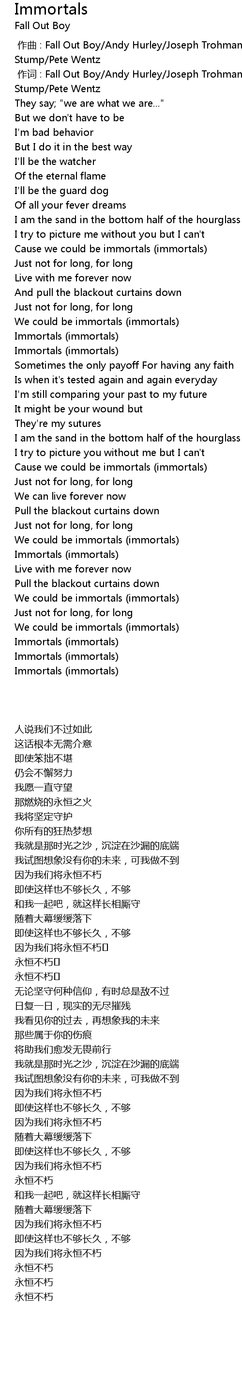| [00:00.00] | zuo qu : Fall Out Boy Andy Hurley Joseph Trohman Patrick Vaughn Stump Pete Wentz |