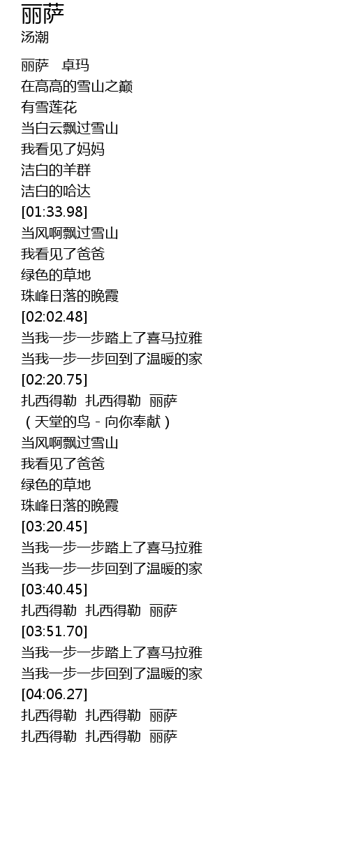| [04:11.04] | 扎西得勒 扎西得勒 丽萨 |