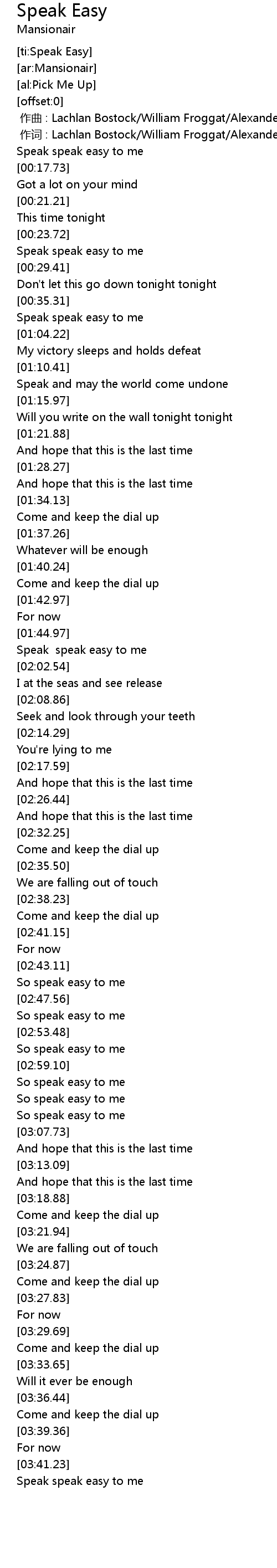 | [03:02.42] | So speak easy to me |