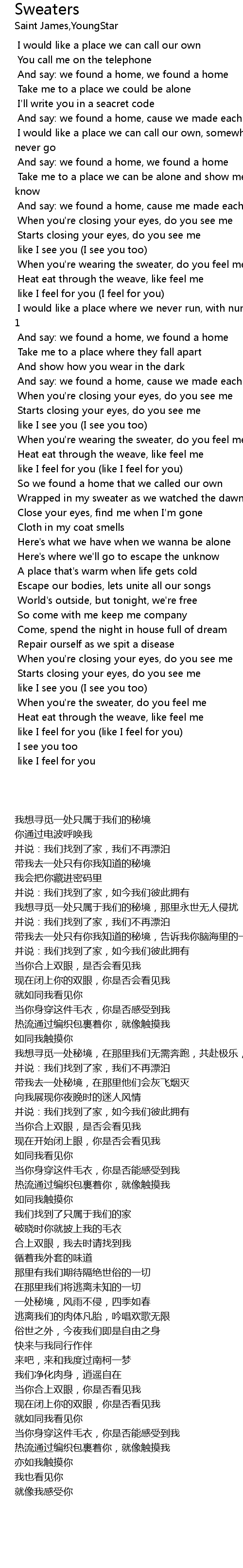 | [01:23.213] | When you're wearing the sweater, do you feel me |
