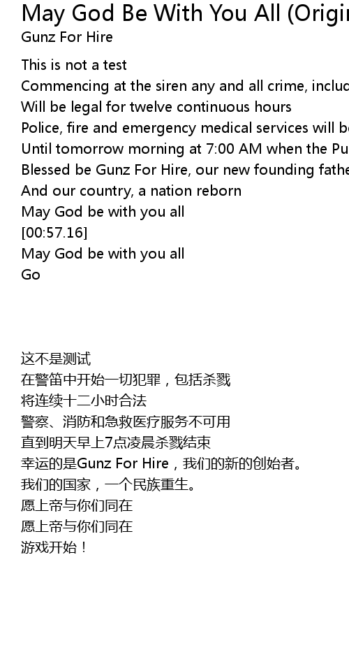 | [00:42.56] | Until tomorrow morning at 7:00 AM when the Purge concludes |