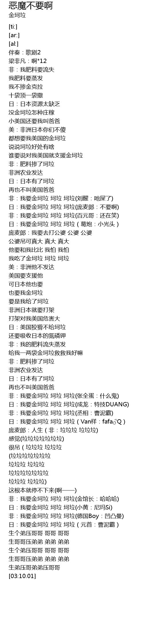| [02:32.52] | 非:我要金坷垃 坷垃 坷垃(金馆长:哈哈哈) |