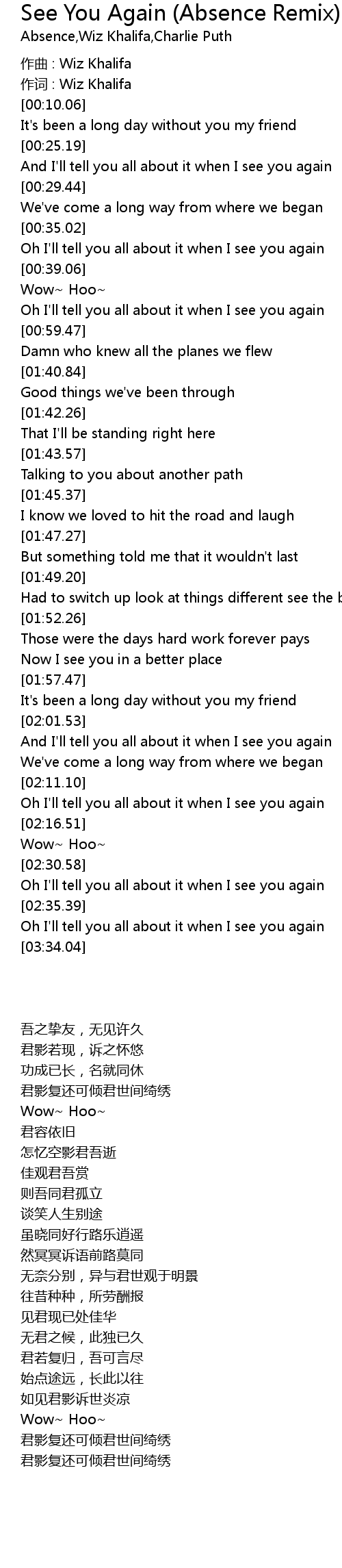 | [00:05.85] | zuo ci : Wiz Khalifa |