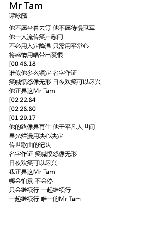 | [03:27.12] | 一起继续行 唯一的Mr Tam |