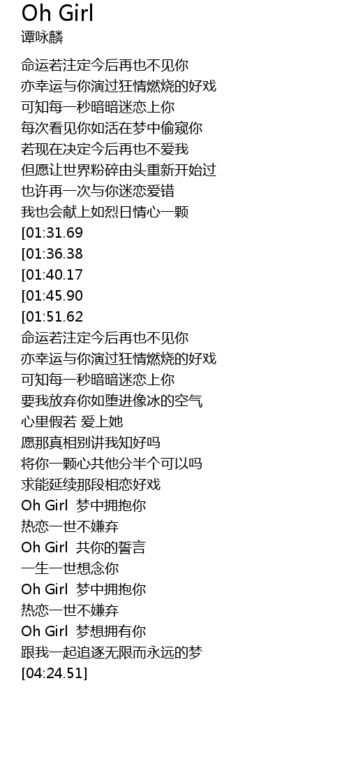 | [02:19.47][01:31.69] | Oh Girl meng zhong yong bao ni |