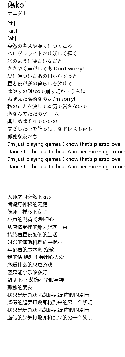 | [02:48.79] | I'm just playing games I know that's plastic love |