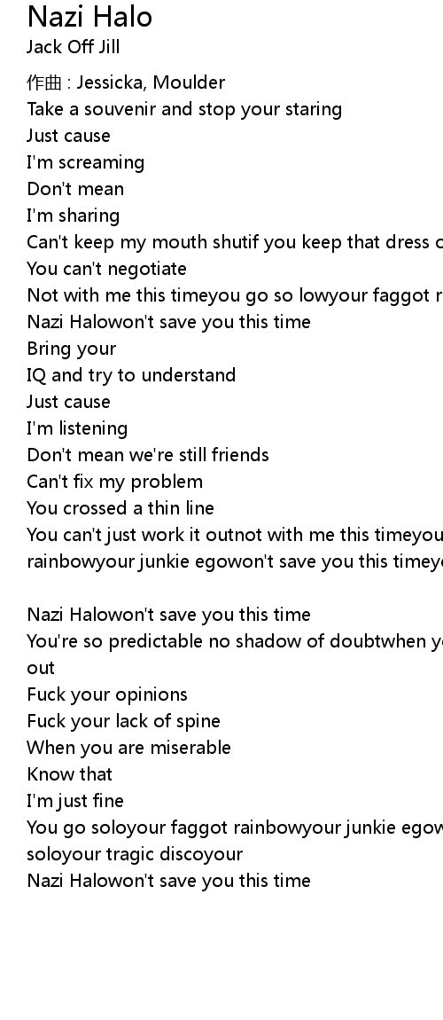 | You can't just work it outnot with me this timeyou go so lowyour faggot rainbowyour junkie egowon't save you this timeyou go so lowyour tragic discoyour | |