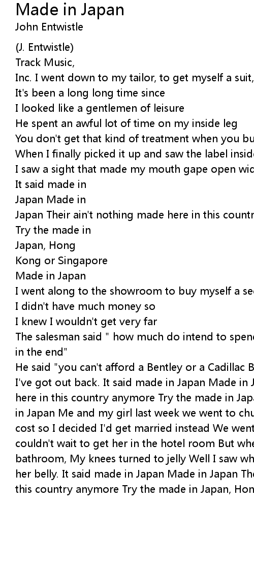 He said "you can't afford a Bentley or a Cadillac But take a look at this motor I've got out back. It said made in Japan Made in Japan Their ain't nothing made here in this country anymore Try the made in Japan, Hong Kong or Singapore Made in Japan Me and my girl last week we went to church and got wed I didn't bother cost so I decided I'd get married instead We went to Miami for the honeymoon I couldn't wait to get her in the hotel room But when she came out of the bathroom, My knees turned to jelly Well I saw what she had tattooed just below her belly. It said made in Japan Made in Japan Their ain't nothing made here in this country anymore Try the made in Japan, Hong Kong or Singapore Made in Japan |