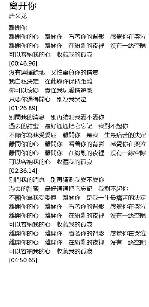 | [01:45.63] | 不願你為我受委屈 離開你 是我一生最痛苦的決定 |